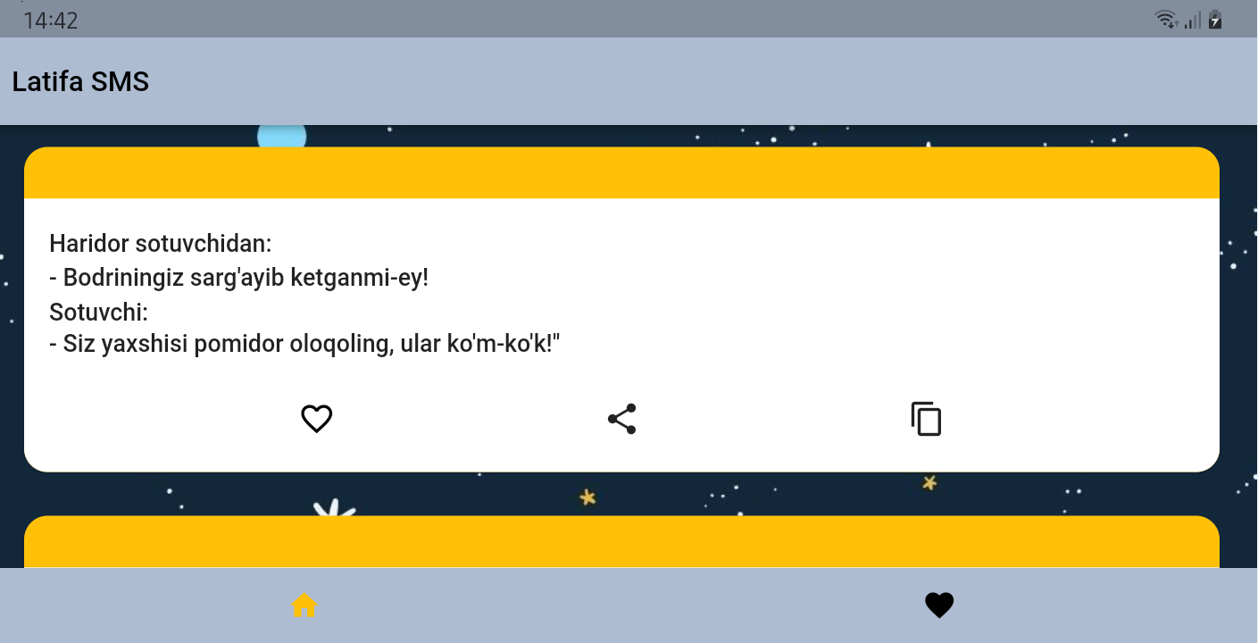 Ushbu Latifa SMS sizga qiziqarli latifalarni taqdim etadi. Siz ushbu latifalarni o'qishingiz mumkin, do'stlaringiz bilan ulashishingiz mumkin va sizga yoqib qolgan latifalani saqlab quyishingiz mumkin.