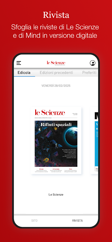 • САЙТ — здесь вы можете получить доступ ко всему содержимому веб-сайтов Le Scienze и Mind прямо в приложении. Изучите постоянно обновляемые статьи и идеи, чтобы оставаться на связи с миром науки и разума.