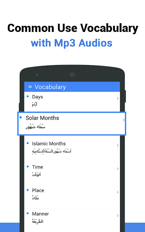 Learn Arabic является образовательным приложением, разработанным для обучения без арабского языка к языку. Это приложение имеет английский на арабский перевод некоторых основных слов и фраз для ознакомления пользователей с арабским языком. Основы арабского языка можно узнать с помощью этого приложения. Это приложение является очень полезным для людей, которые путешествуют на Ближний Восток в первый раз и хотят изучать арабский язык.