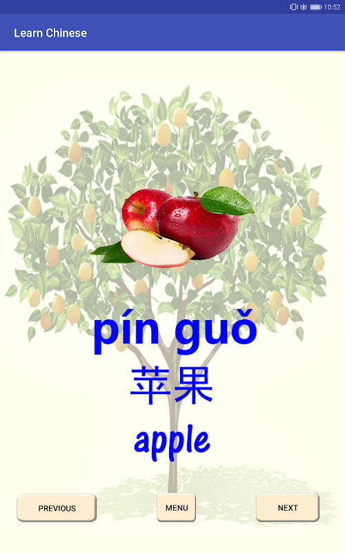 The set of app's will cover from the very basic, this one to advanced grammar. It is not the intention of these app's to teach Chinese characters. The use of Pin Yin is to help with the sounds of words and there similarities to others.
