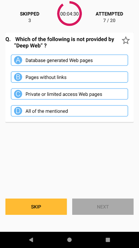Тест MCQs - это знаковая функция приложения Cloud Computing. Это уникальная функция, отличающаяся от других приложений разными аспектами. Функция MCQs Quiz помогает проверить навыки пользователя в реальной смоделированной среде. Функция MCQs Quiz предоставляет пользователю полный контроль над настройкой по своему выбору, например, количество mcqs, количество минут, уровень сложности, случайные mcqs, отрицательная оценка и т. Д.
