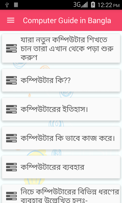 Компьютер Руководство в Bangla приложение предназначено, чтобы помочь своим читателям изучить основы приложения Windows, аппаратные компоненты, а также все основные данные о компьютере в Bangla языке.