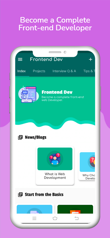 Это приложение дает вам уникальный опыт и ориентировано на веб-разработку через интерфейс. Сначала мы получим профессиональные и бесплатные инструменты веб-разработки, затем мы начнем с HTML. Как только мы преодолеем это расстояние, мы решим нашу первую задачу. Далее изучим HTML5 и приступим к нашему первому проекту.