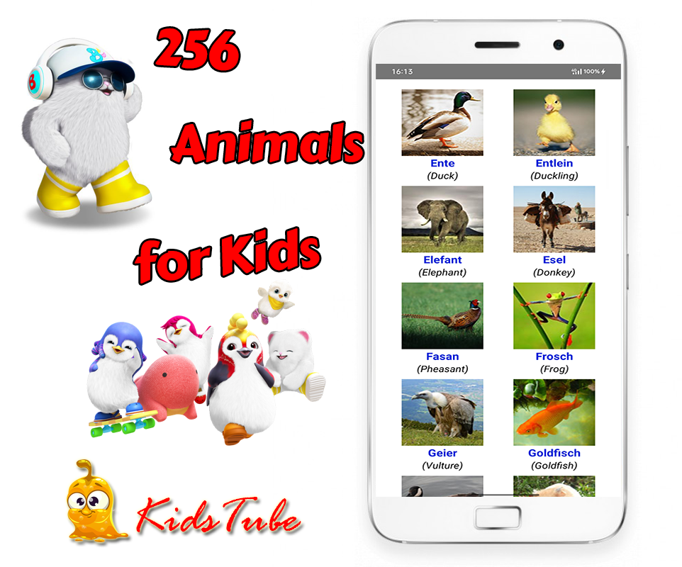* Животные: включает в себя 90 животных с настоящими изображениями. Ваши дети очень любят животных, поэтому они помогают детям произвести впечатление и хотят выучить немецкий язык.