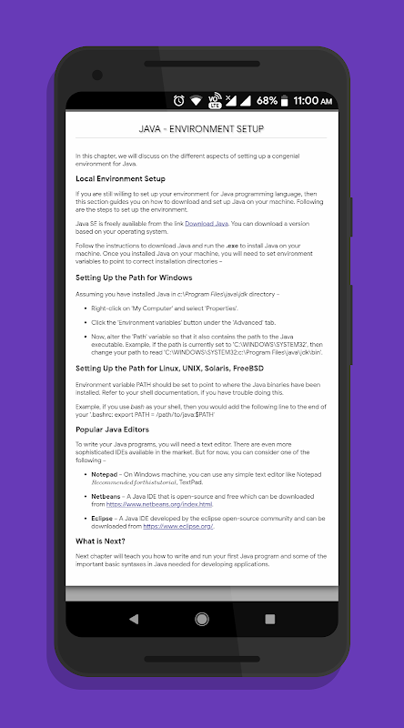 Java Programming is a well structured Core Java tutorial to guide you through one of the tough programming languages. Here's the bummer this app is completely free! No programming experience is needed to go through this guide. After completing the tutorial who can easily code in Java language!