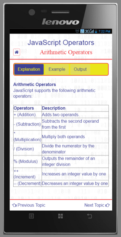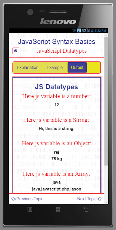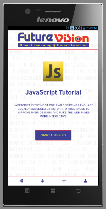JavaScript является одним из наиболее важных языков программирования сегодня. Теперь научиться JavaScript самостоятельно в вашем доме, и это тоже без интернета. Приложение предназначено, чтобы научить вас JavaScript самым простым способом, с хорошо объяснил примеры для лучшего понимания. Вы также можете получить примеры с режимом редактирования, так что вы можете редактировать код в соответствии с вашими требованиями и увидеть результат мгновенно.
