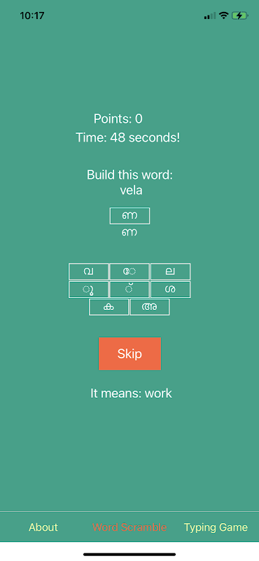 Малаялам — дравидийский язык, на котором говорят на юге Индии, в основном в штате Керала. Он имеет алфавитно-сложный шрифт, типичный для языков Индии. К 2011 году на этом языке было примерно 35 миллионов носителей языка. Это приложение разработано, чтобы помочь вам научиться распознавать все более и более сложные формы букв, пока вы не научитесь читать и составлять полные слова. Сначала начните с изучения гласных, попрактикуйтесь в их написании, а затем попробуйте пройти тест. Тогда попробуйте викторину с диакритическими знаками. Затем переходите к согласным. Это может занять больше времени, так как согласных много. Затем попробуйте пройти викторину с лигатурами согласных и гласных. Наконец, попробуйте викторину с конъюнктивными согласными. Игра в словосочетание позволяет вам попробовать сложить полные слова. Вы также можете попробовать поиграть в набор текста, если на вашем телефоне установлена малаяламская клавиатура.