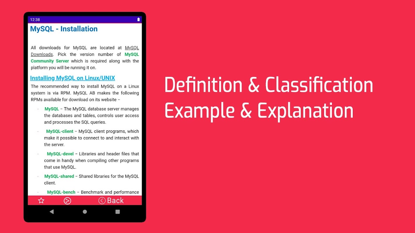 Learn MySQL database tutorial is an educational application. If you are looking for MySQL offline tutorial app so you are in a right place. This application will provide you most important and informative lessons. This MySQL database app will give you definition and classification.