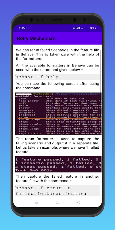 This app is designed for the professionals working in software testing and who want to improve their knowledge on an automation testing tool like Behave. The app contains good amount of illustrations on all important topics in Behave.
