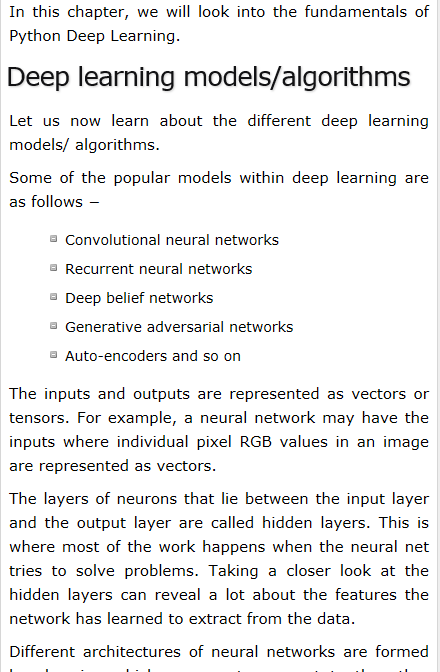 This tutorial has been prepared for professionals aspiring to learn the basics of Python and develop applications involving deep learning techniques such as convolutional neural nets, recurrent nets, back propagation, etc.