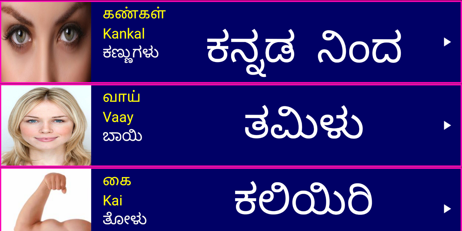 2. Каждое тамильское слово имеет четкое изображение 📸🖼️ и аудио произношение 🎵🔊, что упрощает изучение тамильского языка через каннада.
