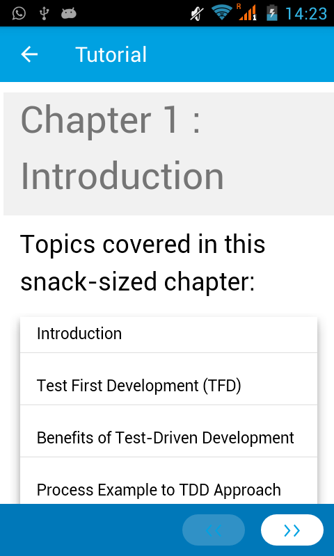 You have limited access to the content provided. For full access to the content, please login and purchase this application. This app provides a quick summary of essential concepts in Test Driven Development by following snack sized chapters: