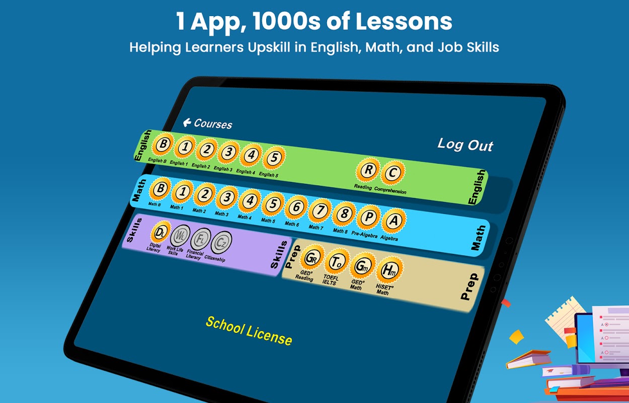 Приложение Learning Upgrade содержит более 1000 уроков. Курсы повышения квалификации английского языка включают уроки фонетики, декодирования, лексики, грамматики, письма, аудирования и многого другого. Курсы Math Upgrade включают уроки по дробям, процентам, статистике, текстовым задачам, геометрии, алгебре и многому другому.