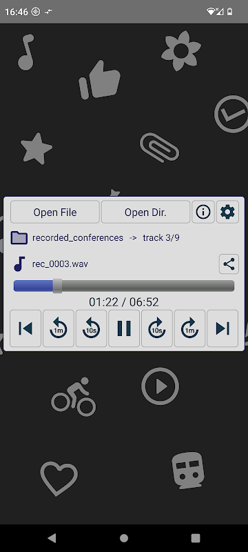 - ползунок положения, кнопки перемотка вперед / назад +/- 1 мин, +/- 10 сек.