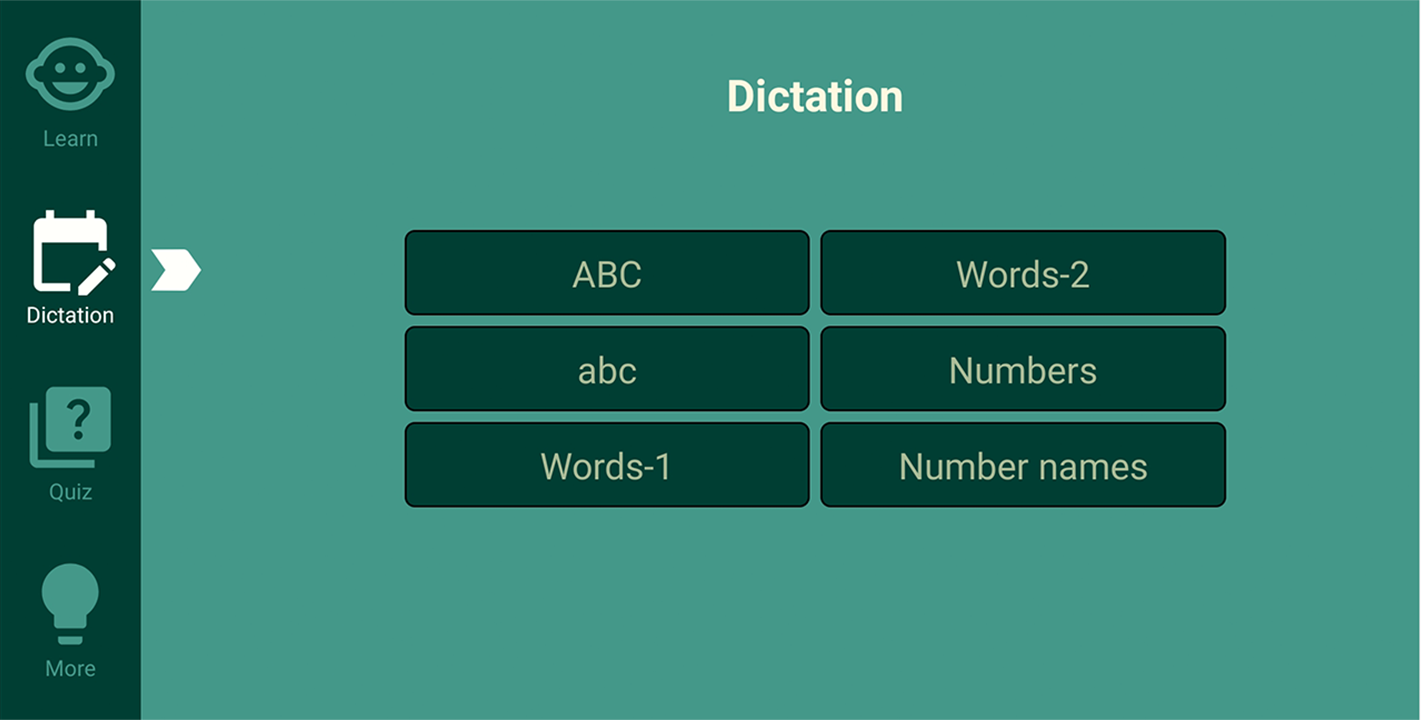 Диктовка: в этом разделе есть различные занятия, где можно выучить азбуку, 123, написание и многое другое.