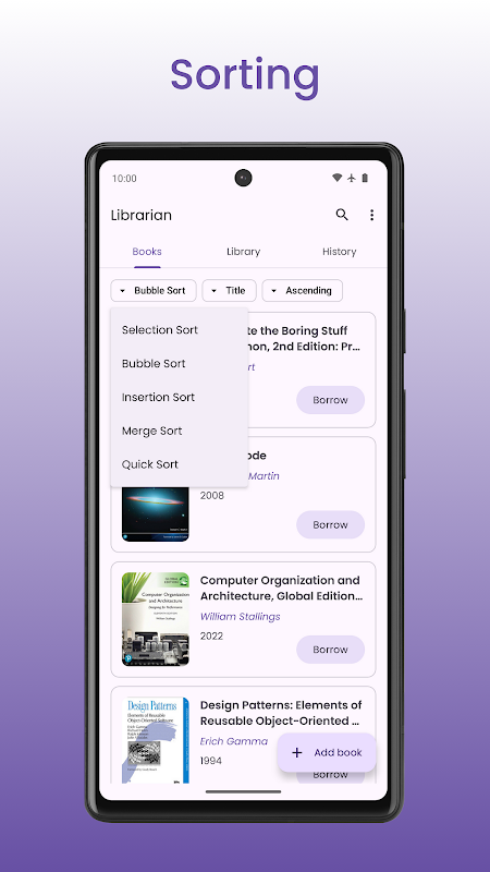 Librarian — это приложение-визуализатор сортировки, которое моделирует управление библиотекой и демонстрирует алгоритмы сортировки. Изучите различные алгоритмы сортировки и почувствуйте суть библиотечных операций.