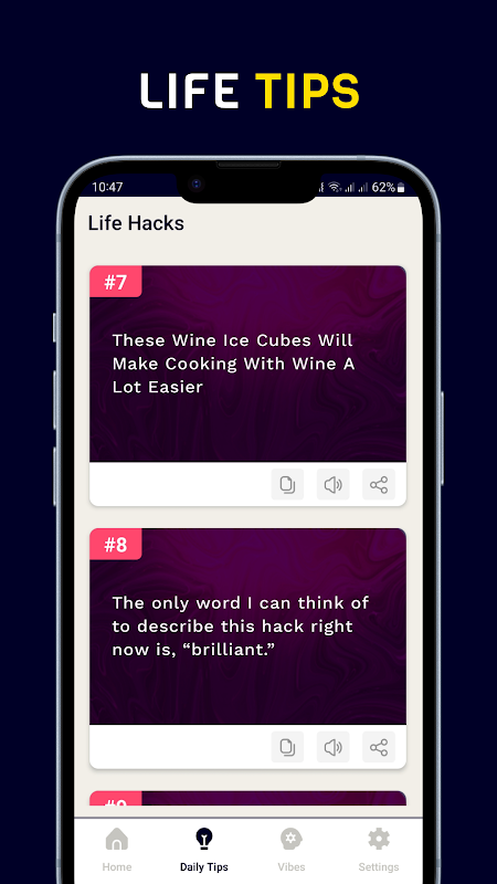 Используя приложение с советами и рекомендациями, вы можете сделать свою жизнь проще и счастливее. С этими жизненными советами вы можете узнать много знаний и хитростей, чтобы сэкономить кучу времени. Я почти уверен, что вы найдете это приложение очень полезным, а также поделитесь ежедневными лайфхаками со своими друзьями и членами семьи.
