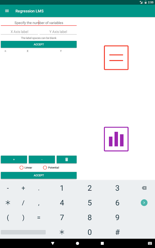 The purpose of this application is to find the best fit line using the least squares method in linear and potential models.
