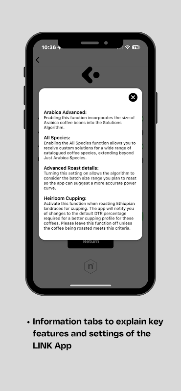 Приложение Link — это сопутствующее мобильное приложение для Link Sample Roaster от Nucleus Coffee Tools и Kaffelogic. Используя это приложение, пользователи Link могут ввести различную информацию о кофе, который они хотят обжарить, а алгоритмический выбор профиля приложения предоставит наиболее идеальные рекомендации для пакета профилей обжарки, кривой мощности/профиля обжарки, предлагаемого диапазона развития, действия вентилятора ( скорость вентилятора) и ожидаемое количество первого взлома для каждого кофе.