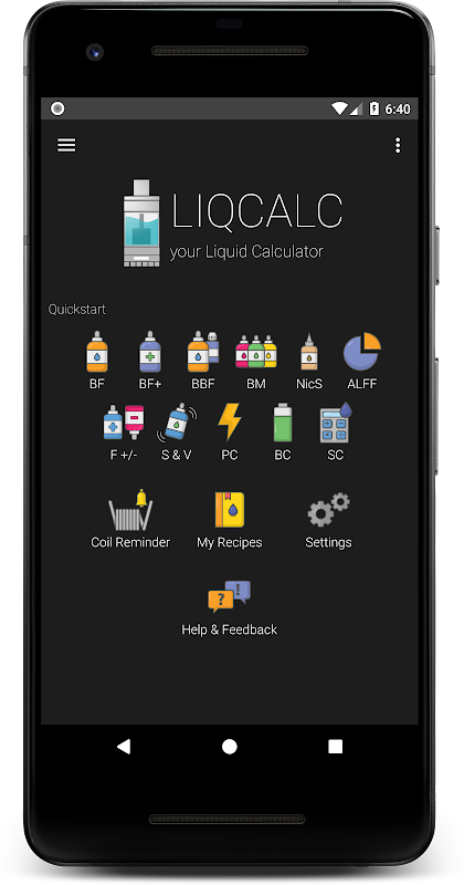 LiqCalc - идеальное приложение для каждой гаммы! Независимо от того, как рассчитывается ваш жидкий / E-сок, использование удобного интерфейса сделает расчет быстрым & простым !