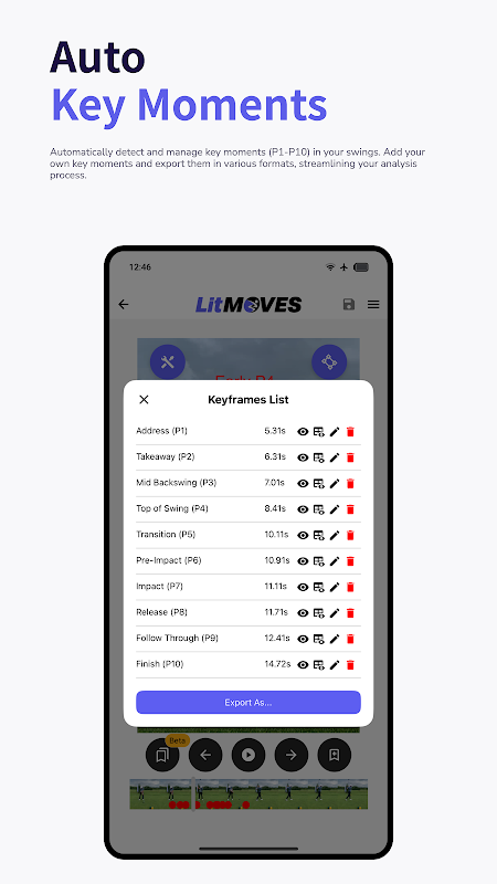 Улучшите свою игру в гольф с помощью LitMoves, незаменимого приложения для детального анализа ударов. Независимо от того, новичок вы или профессионал, LitMoves предлагает мощные инструменты для совершенствования вашей техники и отслеживания вашего прогресса.
