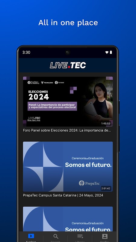 Наслаждайтесь живым контентом Tecnológico de Monterrey, созданным школами, мероприятиями, институтами и инициативами, в том числе выпускниками средних школ, профессиональных учебных заведений и аспирантов. А также контент OnDemand, посвященный предпринимательству, образованию, процветанию человека, благополучию, здоровью, инновациям, технологиям, экосистеме Tec и другим.