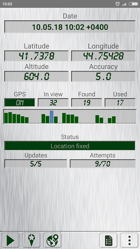 - Показывает широта, долгота, высота, точность, дата / время. Спутники в поле зрения, нашли, используется. Обновления Место и попытки чтения.