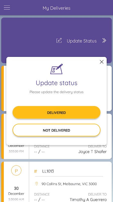 Как только доставка прибывает, она назначается водителю в зависимости от его доступности, что может быть сделано вручную автоматически. Система гарантирует, что она обеспечивает самый быстрый маршрут доставки, и доставка происходит эффективно. Информация о доставке в реальном времени, включая местоположение и ETA, передается клиенту.