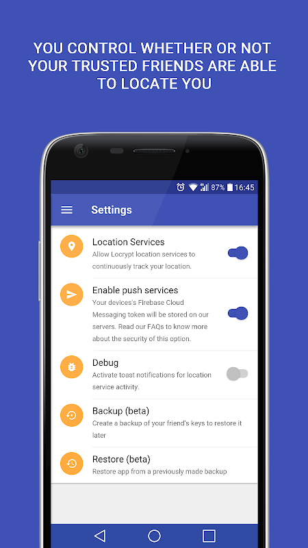 Ni Locrypt ni personas ajenas a tu grupo conocerán la localización de ninguno de los miembros, pues la localización está encriptada de punto a punto, con una encriptación AES 256.