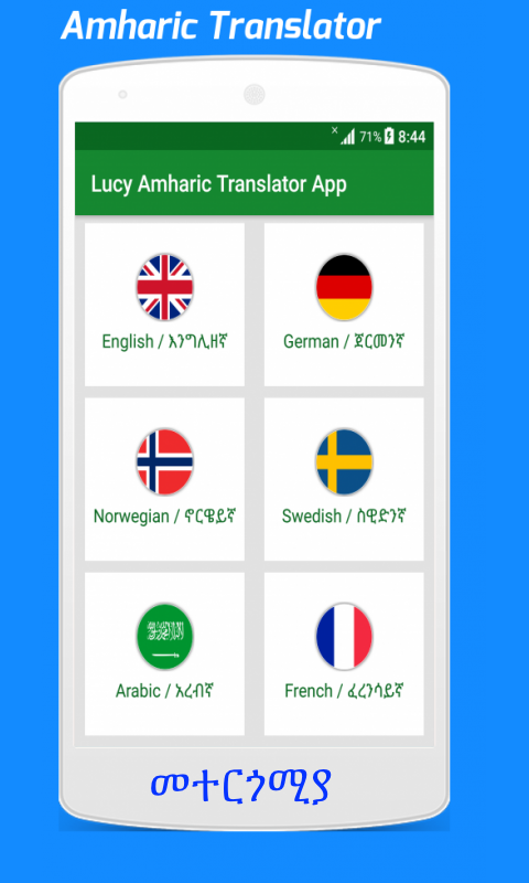 ሉሲ የአማርኛ መተርጎሚያ ምርጥ አፕ! አማርኛ ን ወደ አረብኛ፣ ኢንግሊዝኛ፣ ፈረንሳይኛ፣ ጀርመንኛ፣ ኖርወይኛ፣ ስዊዲንኛ፣ ደችኛ - ሆላንድ ወይም ኔዘርላንድ፣ ስዊድንኛ፣ ጣሊያንኛ ይተረጉምሎታል.