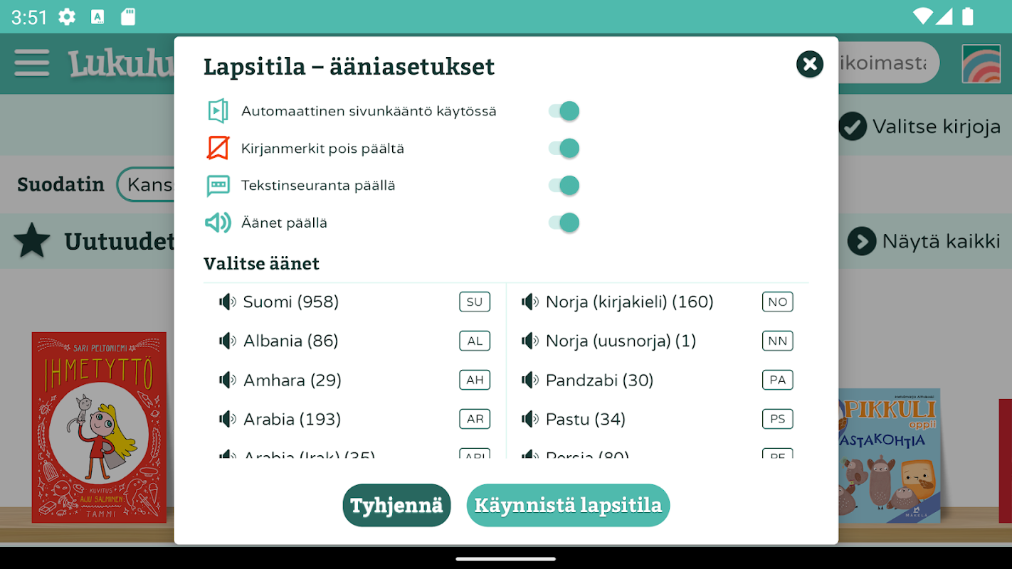 Reading Enchantment - это служба цифровых книг, которая предлагает книги с картинками для чтения вслух для детей младшего возраста и начальной школы. Книги службы можно слушать на финском, а также можно говорить на нескольких языках, например на шведском, английском, албанском, арабском, сомалийском, русском и эстонском языках.