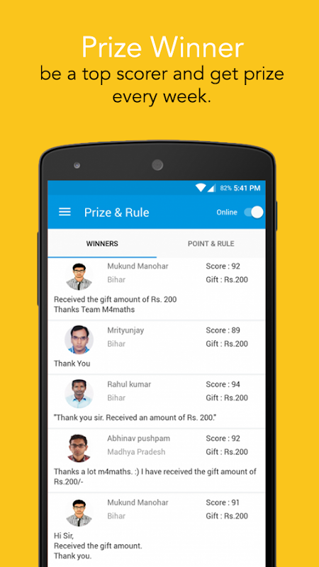 Вопрос задается ежедневно по будням в 11: 00hrs (GMT + 5: 30), разработанный нашими специалистами, отвечая на его правильно будет выиграть очки пользователей, максимальное количество баллов составляет 20 на основе времени отклика пользователя. Эти точки помогают пользователям выиграть еженедельные денежные призы, начиная от 200Rs до 11,000Rs. Ответы на вопрос будет показан на следующий день с экспертом и решение лучшего пользователя. Список и рейтинг ежедневных и еженедельных победителя будет отображаться в приложении.