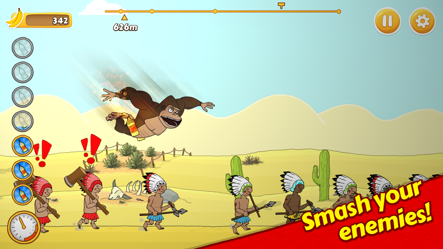 Gorilla Bobo was going to forest for bananas, to cave for refreshment in hot days and he was enjoying freedom. At least until aborigines from tribe Hulu surprised Bobo in sleep, tied him and locked into a cage. They started using him to drag heavy stones for camp fortification. However Bobo didn't want to live as slave, so one day he got really angry. He managed to break the cage and pull a catapult. He told himself, that it would be much better to ovefly them, than to fight.
