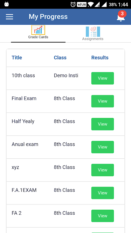 Update about child's exams and assignments and their results.