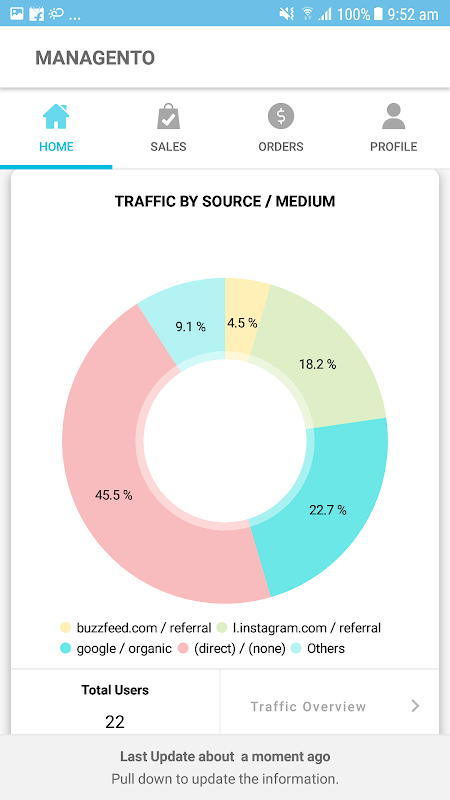 Managento is an app that helps Magento (version 2.3) users keep in touch with their online stores from their mobile devices. The best part about the Managento is that it provides the store owners with 24/7 access to their store from anywhere. Besides giving you real time notifications on the sales, order & delivery status you also can access Google Analytics information for your store.