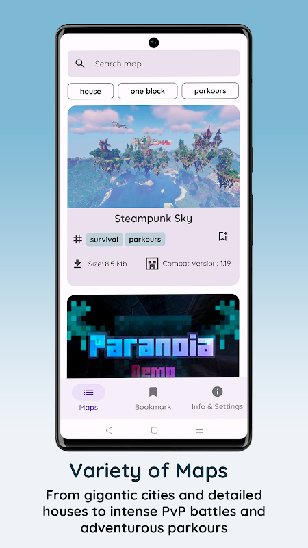 Добро пожаловать в непревзойденный опыт просмотра и установки карт для Minecraft PE! С нашей обширной коллекцией открывайте и устанавливайте сотни невероятных карт одним касанием, делая ваш игровой мир еще более живым, чем когда-либо.