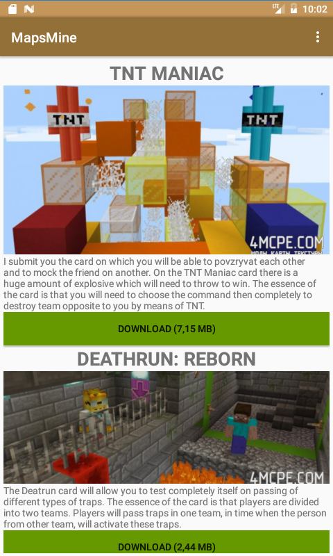 У каждой карты для Майнкрафт ПЕ есть картинка, краткое описание и зелёная кнопка "Скачать". Так же имеется размер карты в мегабайтах.