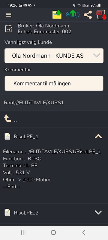 С помощью программного обеспечения на телефоне можно создать структуру измерений / список курсов, которые можно отправить в прибор для сохранения всех измерений. После того, как измерения сохранены в структуре, результаты могут быть получены из прибора, а полный отчет в формате PDF можно распечатать или сохранить.