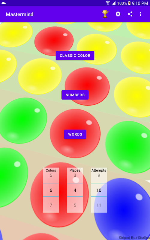 Существует три режима игры: цветные шарики, числа и слова. Каждый из них имеет свою собственную сложность. Например, головоломка из 6 цветов с 4 размещениями (классическая версия игры) имеет 1296 возможных комбинаций. Головоломка из 10 цифр с тем же количеством размещений имеет 10 000 возможных комбинаций. Для игры в слова требуется, чтобы каждое предположение было английским словом, и для проверки предположений используется словарь из более чем 100 тыс. английских слов. Для кодовых слов используется меньший список из примерно 4000 общих слов.