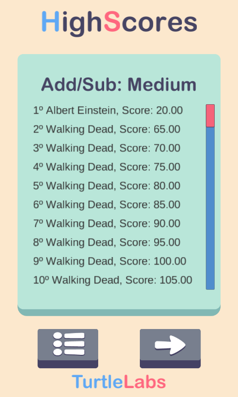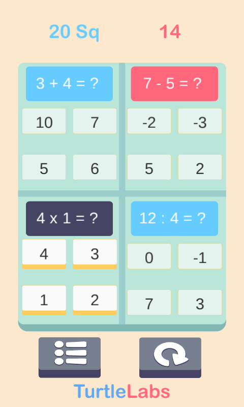 * Режим обучения: Режим обучения состоит из двух разделов: 1) Таблицы умножения и деления и 2) Режим бесплатного обучения. Здесь вы можете постоянно работать над своей арифметикой без временных ограничений. На одном хорошо продуманном экране, который позволит вам одним щелчком мыши изменить практически все, что вы делаете. Здесь вы сможете поработать над той же математикой, которую найдете в режиме игры. В режиме обучения почти все на вашем экране кликабельно. Нажмите один из этих математических символов, чтобы выбрать другого арифметического оператора, или нажмите «вверх» или «вниз», чтобы увеличить или уменьшить уровень сложности. Мы работали, здесь TurtleLabs, чтобы сделать ваш опыт работы и игры с Math Challenge, в простой и интуитивно понятный, насколько это возможно.