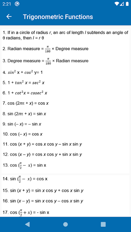 В этом автономном приложении есть коллекция математических формул от 6 до 12 классов по главам. Оно также содержит важные примечания и определения, которые будут очень полезны в качестве краткого справочника перед экзаменами.