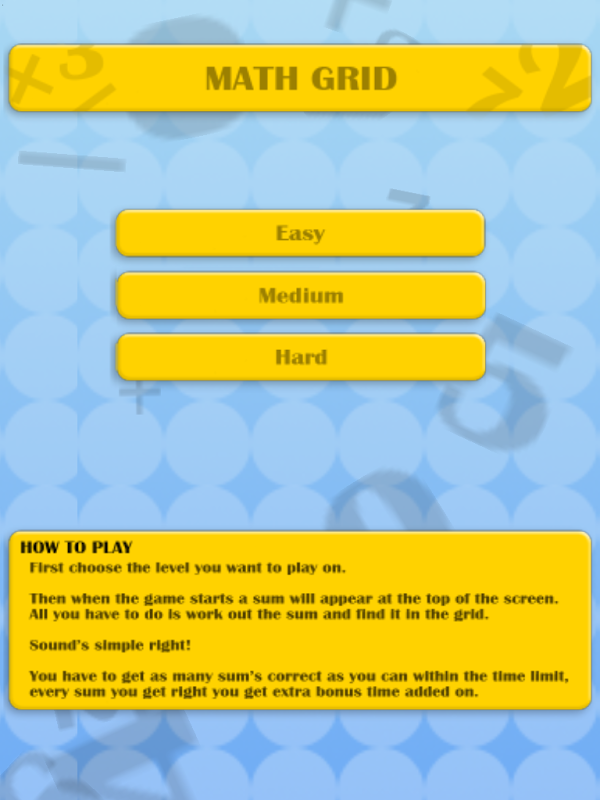 I forgot to mention there is a time limit, so how many sums can you get right, every one you get right you get extra time added on. How long can you last? try all the different levels, start of simple with additions and end up with multiplications. The harder the level the bigger the numbers.