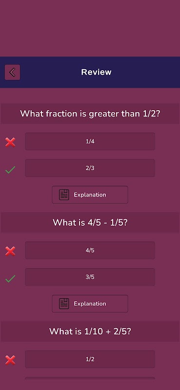 Это приложение также позволяет вам просматривать свои ответы в конце теста, предоставляя краткое объяснение для каждого вопроса. После завершения теста вы можете увидеть, какие ответы были правильными и почему они были правильным выбором. Эта функция помогает вам учиться на любых ошибках, закрепляя ваше понимание материала и улучшая ваши математические навыки. Это идеальный способ не только проверить свои знания, но и глубже понять концепции, лежащие в основе вопросов.