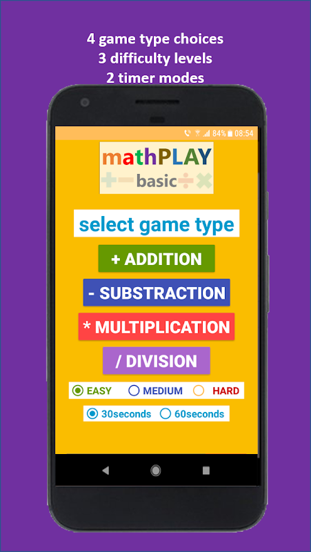 There are 4 game options: Adding, Substraction, Multiplication and Division.