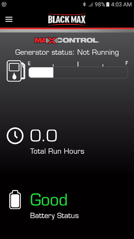 Black Max ™ MAXCONTROLTM App позволяет соединить ваш смартфон с Black BM907500BT Generator Max ™ с использованием технологии Bluetooth. Приложение беспроводной связи отображает уровень в реальном времени топлива, уровень нагрузки на каждом выходе, и оставшееся время работы вашего генератора. Приложение также позволяет мгновенного дистанционного отключения или отключения после запланированного интервала времени. Информация, отображаемая в MAXCONTROLTM приложение соответствует информации, отображаемой на ЖК-экране вашего генератора.