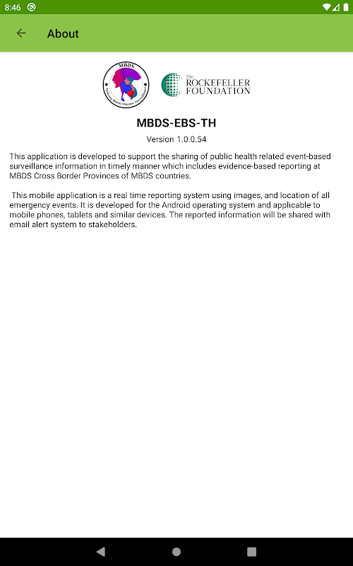 Это приложение разработано для поддержки своевременного обмена информацией по эпиднадзору на основе событий, связанных с общественным здоровьем, включая отчеты на основе фактов в трансграничных провинциях MBDS стран MBDS.