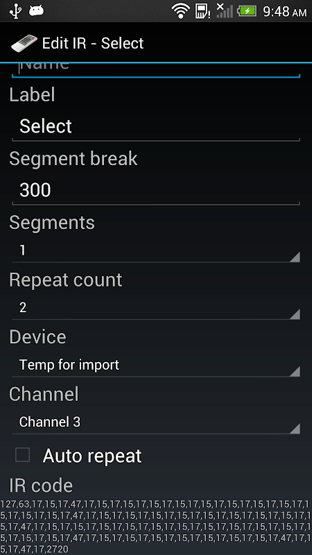 - Once the IR code is received an editing testing screen will open where you can test the programmed button