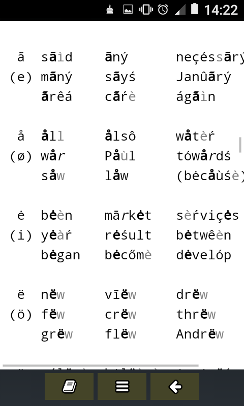 This is an interactive book that allows varying amounts of phonic assistance to be added to English words. (Best with latest Android-System-WebView: see Play Store)