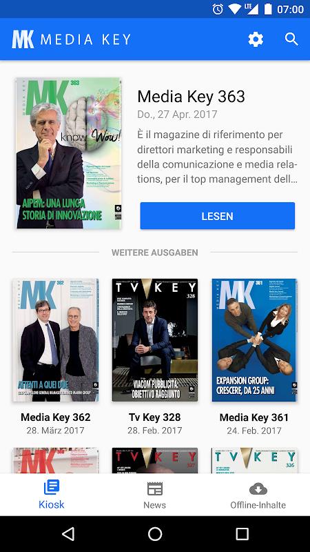 Специальные издания. Каждый год, редакция Key Media Group предлагает своим читателям специальные издания большого формата, которые анализируют и расследования вопросов, представляющих особый интерес для Ежегодного Media Key (всеобъемлющее руководство к рынку и к команде связи), Genius (объем, посвященные началу управление компаниями и агентствами), ежегодный Tv Key (путеводитель в мире телевизионного производства), TV Genius Key (к высшему руководству вещателей и производства).