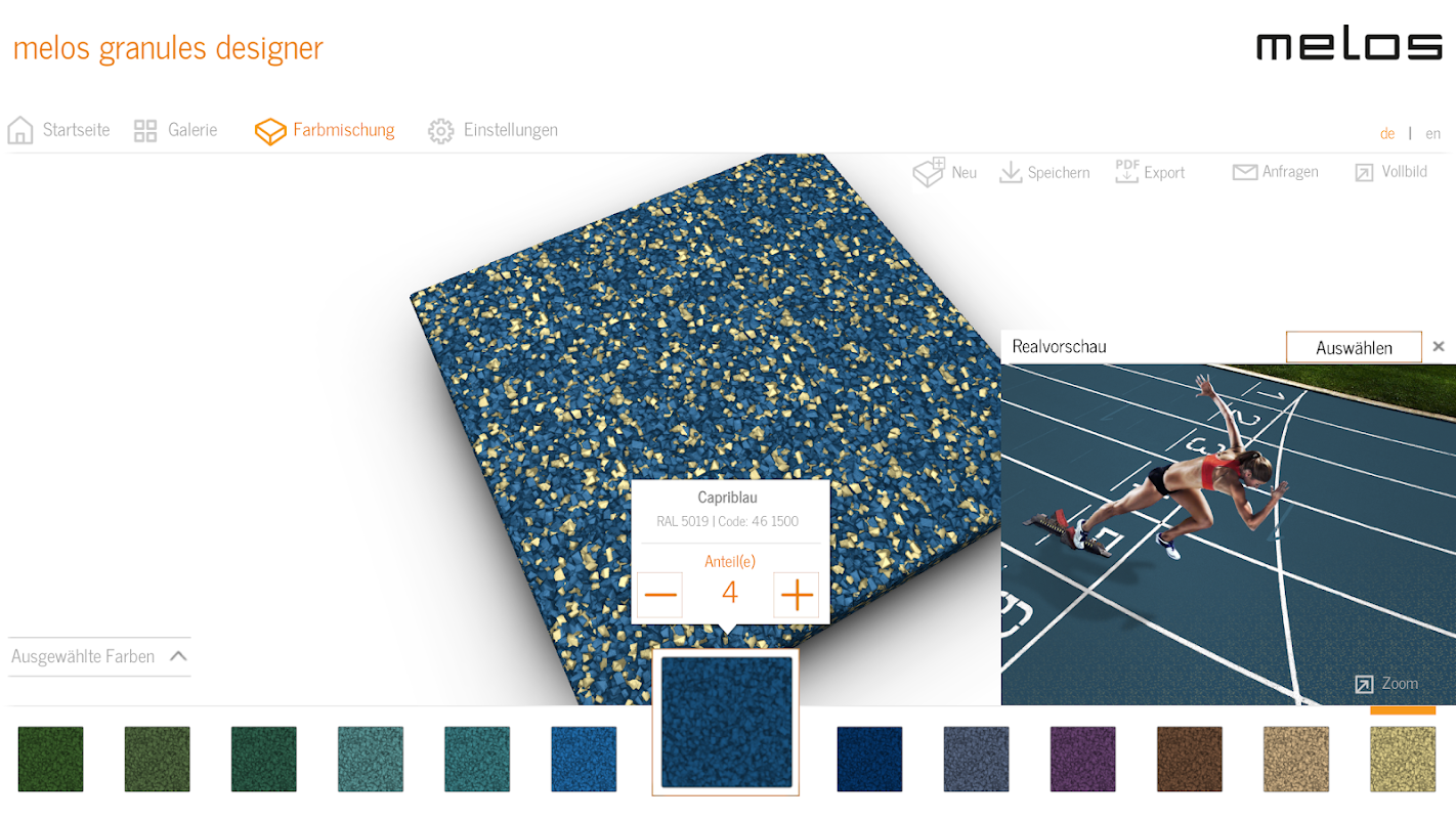 Конструктор гранул явно впечатляет своим реалистичным представлением: увеличьте свой цветовой микс и испытайте впечатляющее разнообразие цветов и структурных тонкостей вашего эксклюзивного дизайна гранул! На виртуальной 3D-модели можно исследовать все детали пространственно и по всей их поверхности.